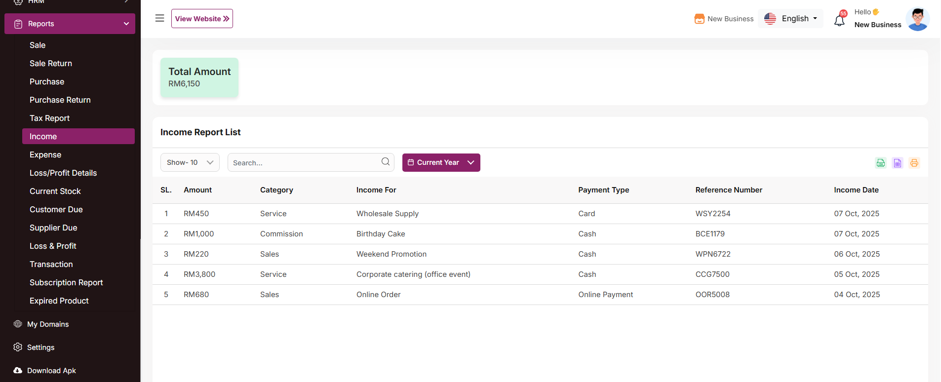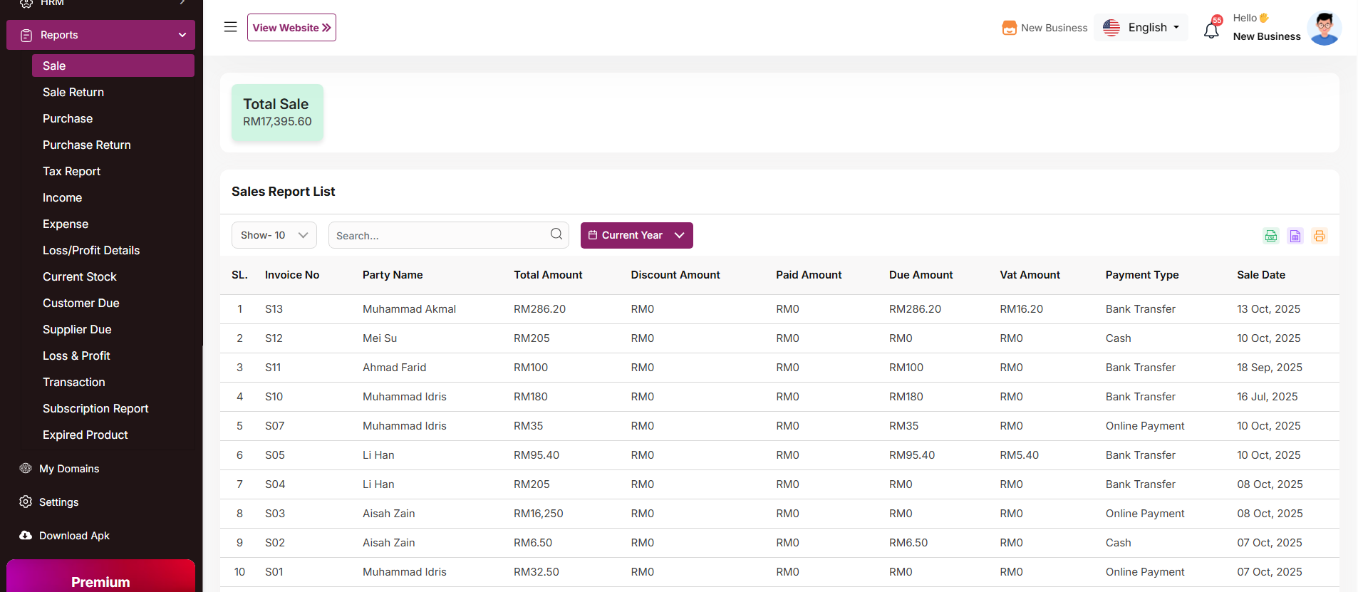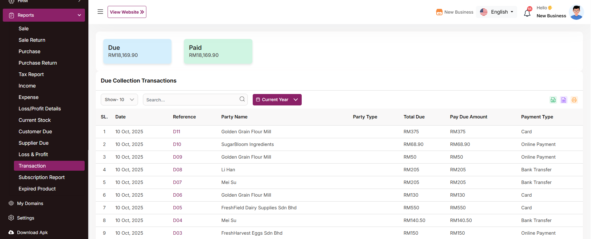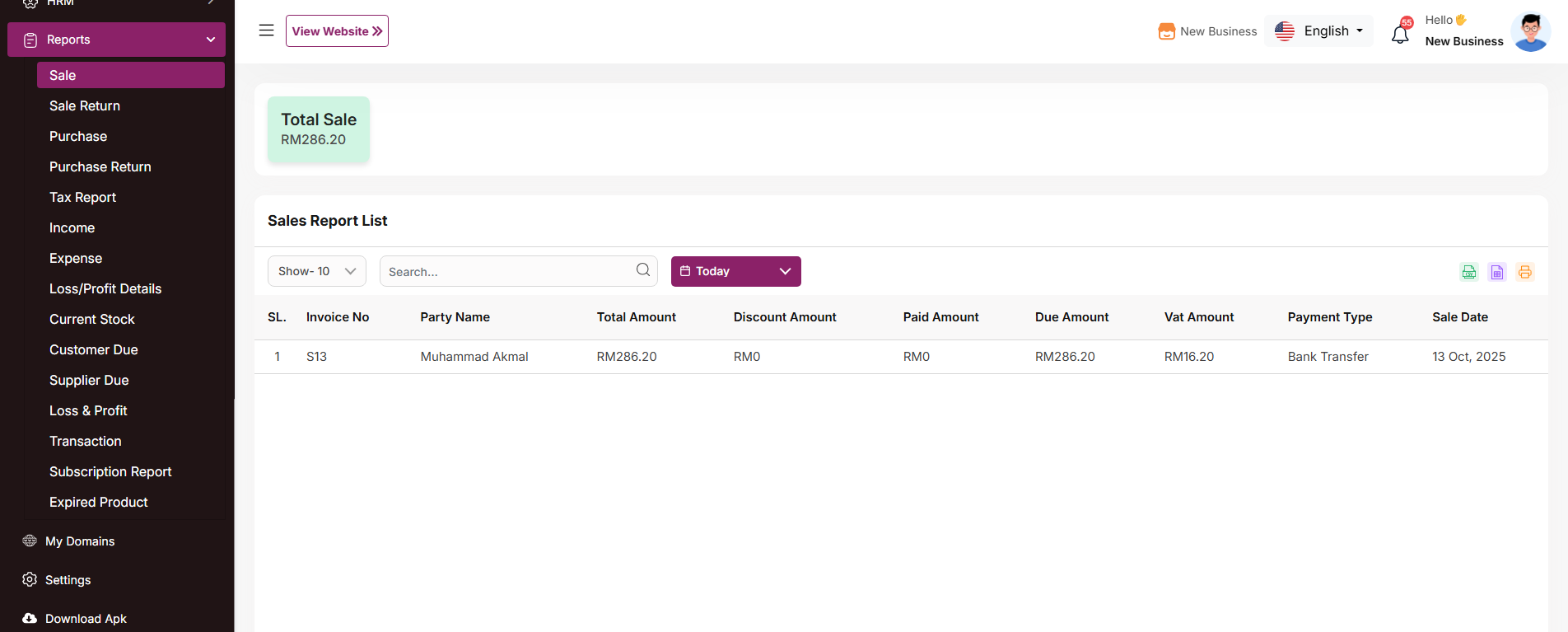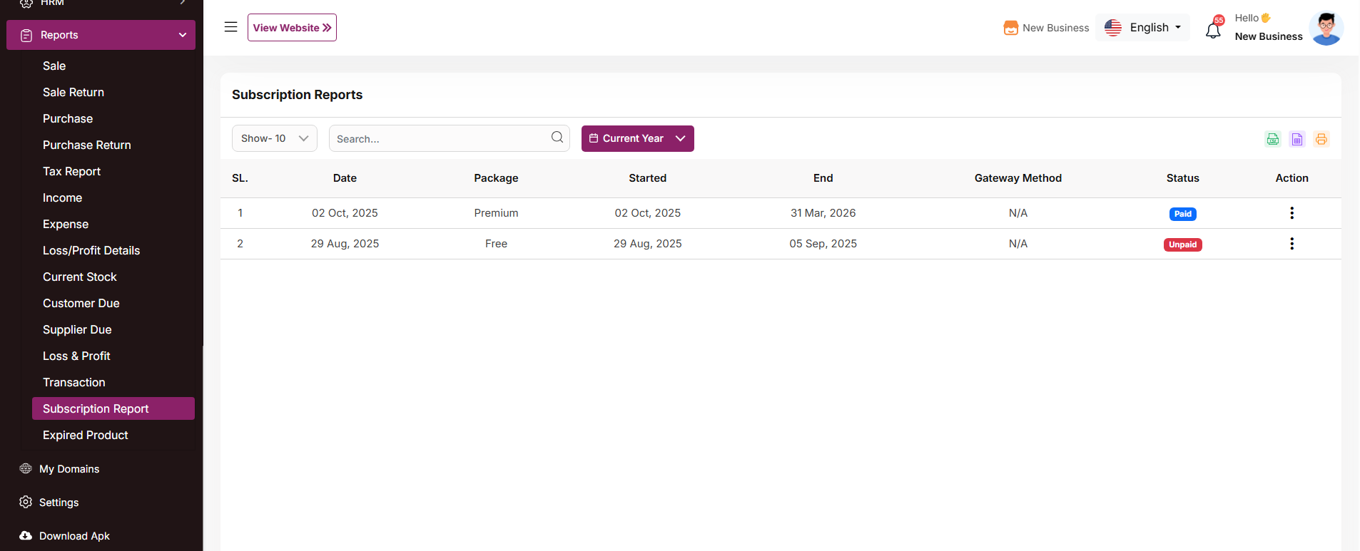 Here, various reports are available, including Sale, Sale Return, Purchase, Purchase Return, Income, Expense, Current Stock, Customer Due, Supplier Due, Profit and Loss, and Due collection Transaction. Each report includes filtering options for data. Additionally, you can export data as CSV, Excel, and a Print option is also provided.