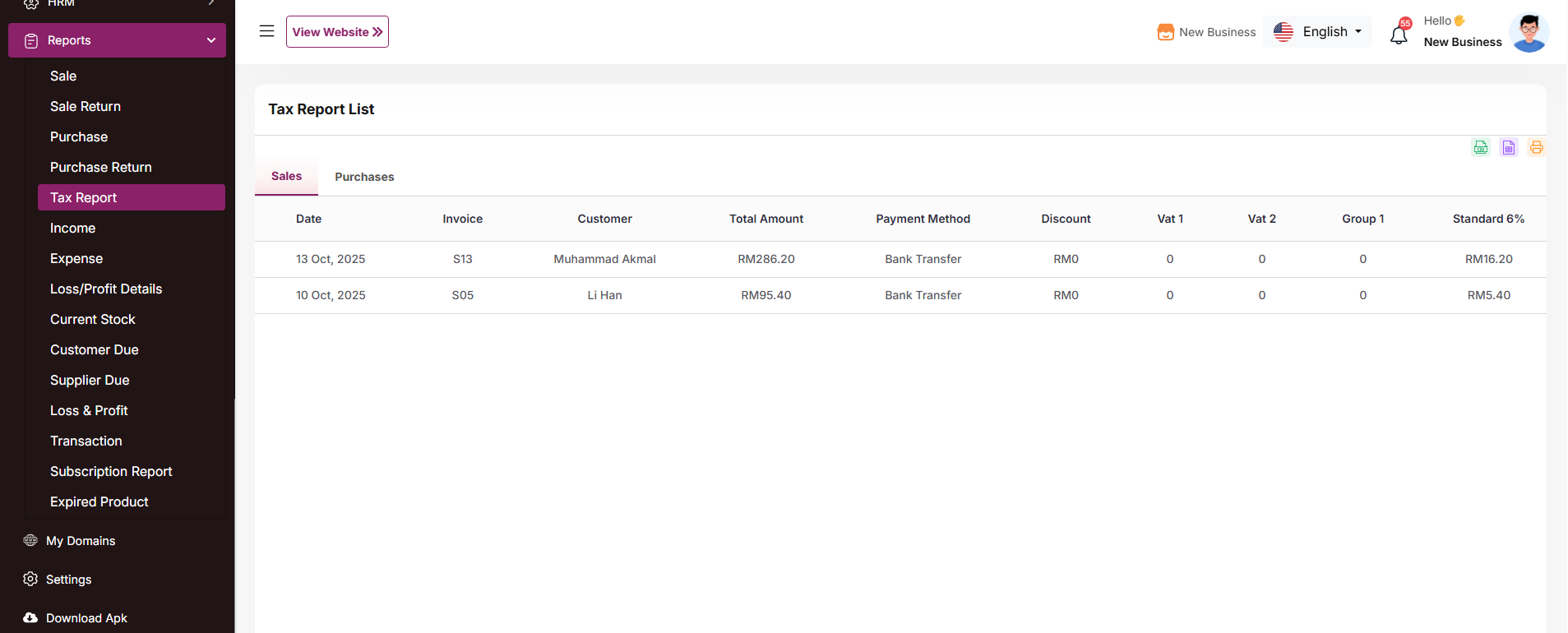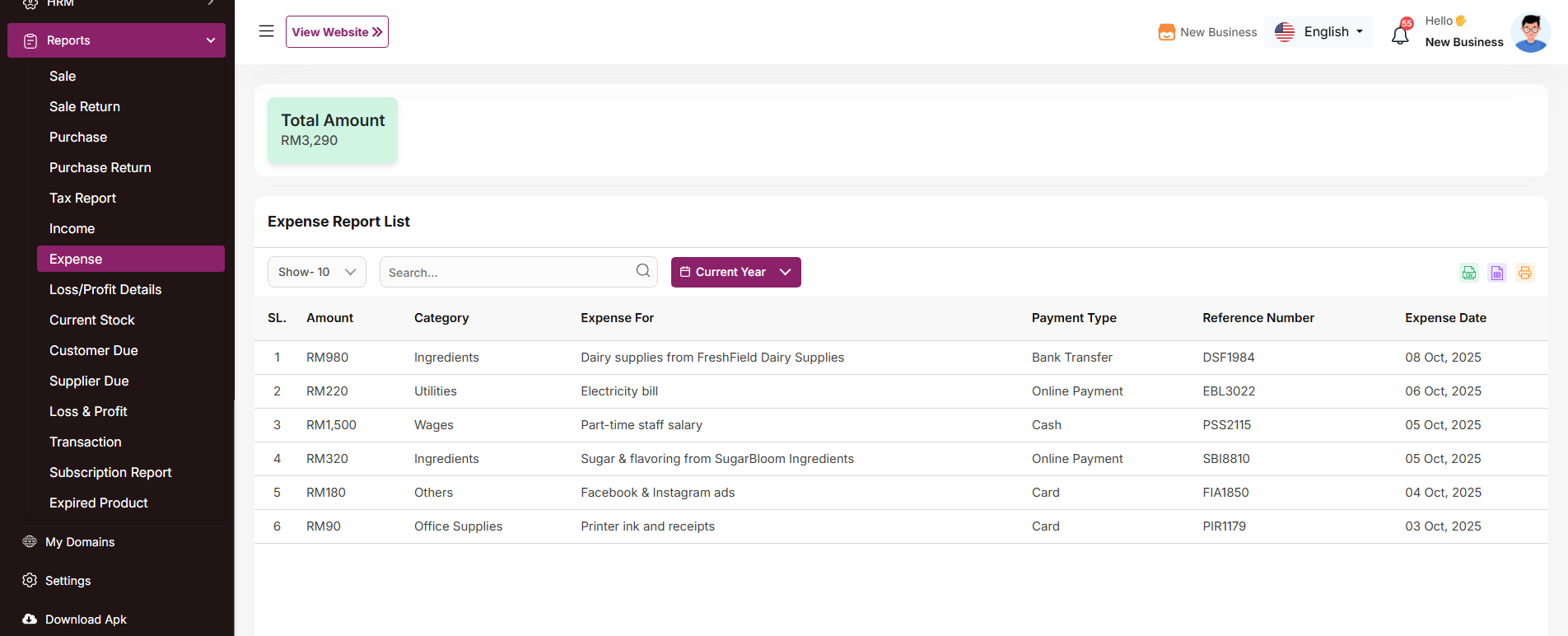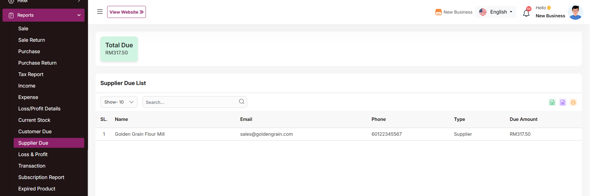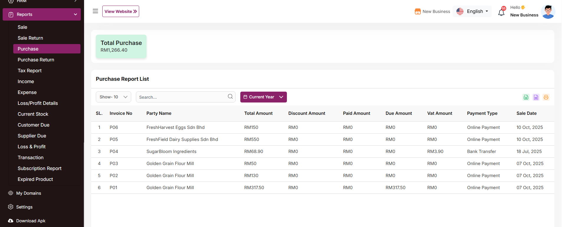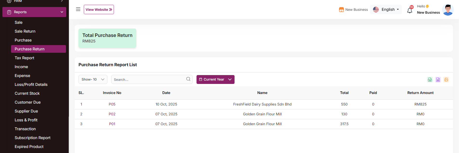 Here, various reports are available, including Sale, Sale Return, Purchase, Purchase Return, Income, Expense, Current Stock, Customer Due, Supplier Due, Profit and Loss, and Due collection Transaction. Each report includes filtering options for data. Additionally, you can export data as CSV, Excel, and a Print option is also provided.