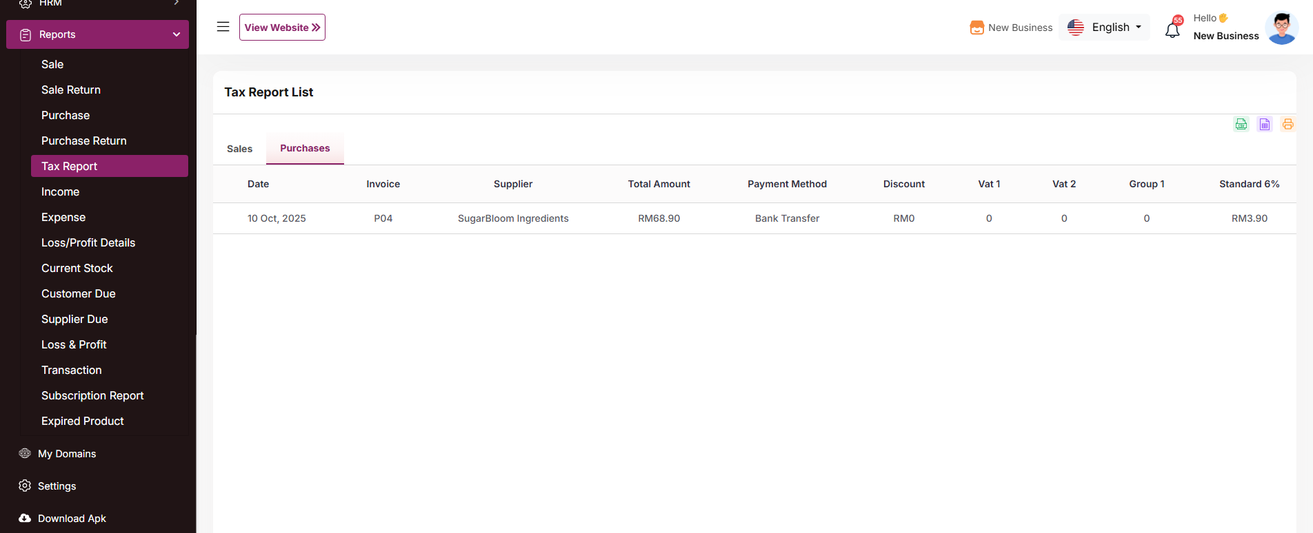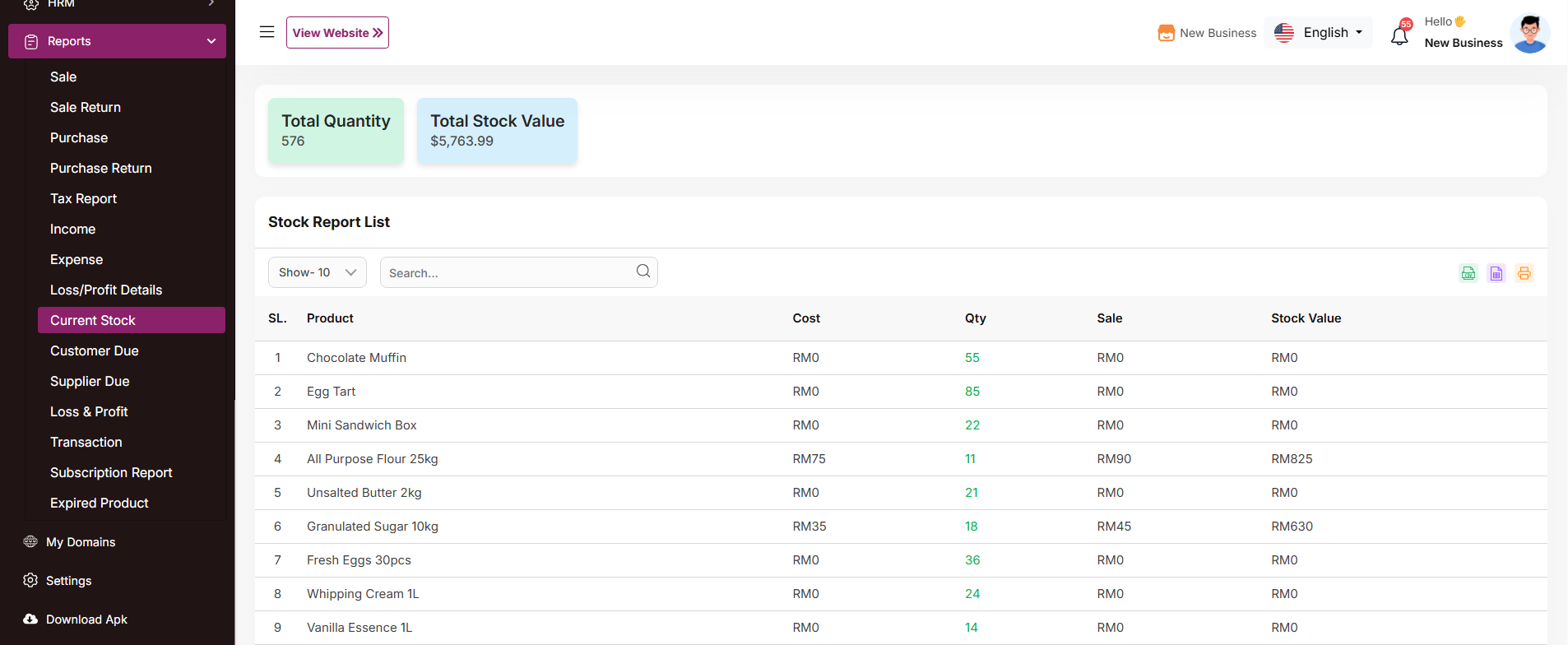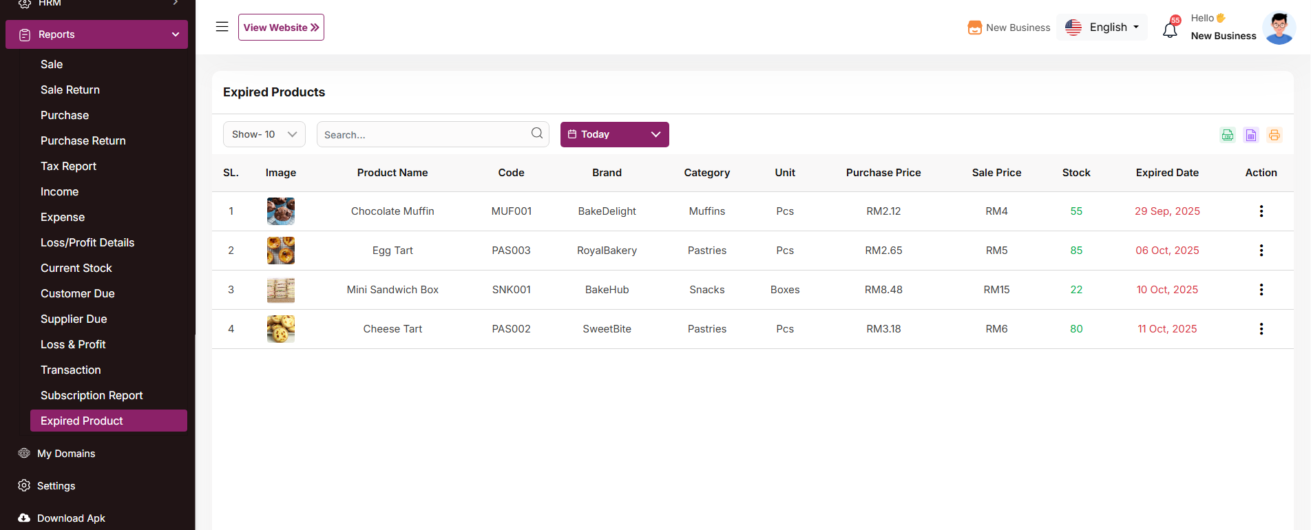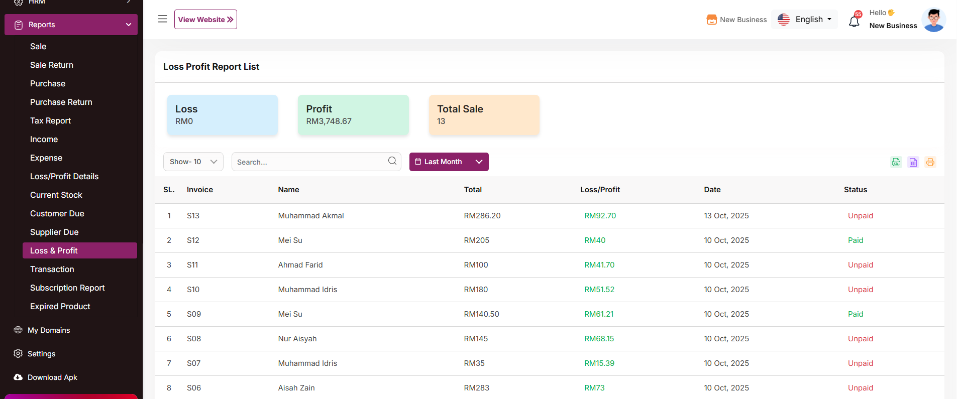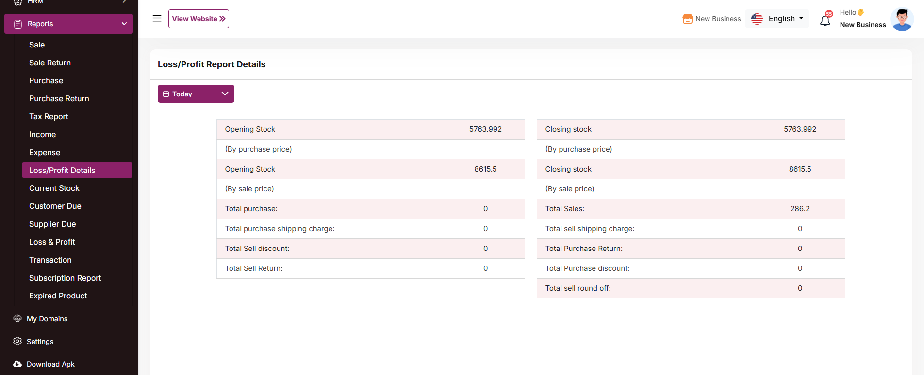 Here, various reports are available, including Sale, Sale Return, Purchase, Purchase Return, Income, Expense, Current Stock, Customer Due, Supplier Due, Profit and Loss, and Due collection Transaction. Each report includes filtering options for data. Additionally, you can export data as CSV, Excel, and a Print option is also provided.