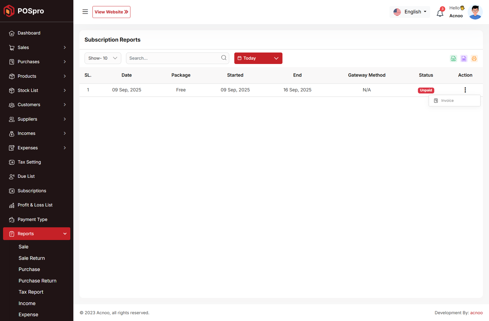 Here, various reports are available, including Sale, Sale Return, Purchase, Purchase Return, Income, Expense, Current Stock, Customer Due, Supplier Due, Profit and Loss, and Due collection Transaction. Each report includes filtering options for data. Additionally, you can export data as CSV, Excel, and a Print option is also provided.