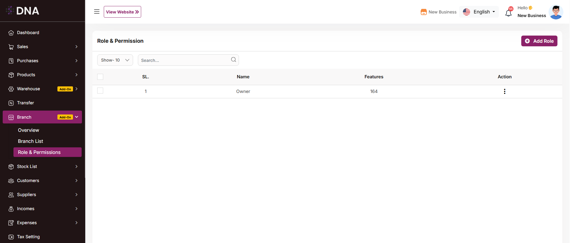 Here, you can view a list of roles and permissions. The list displays name along with the number of features accessible to users. You can filter the list using the search input field or the per-page filter option. From here, you can also add a new user role, edit an existing role, or delete one. Multi-delete functionality is also available.
