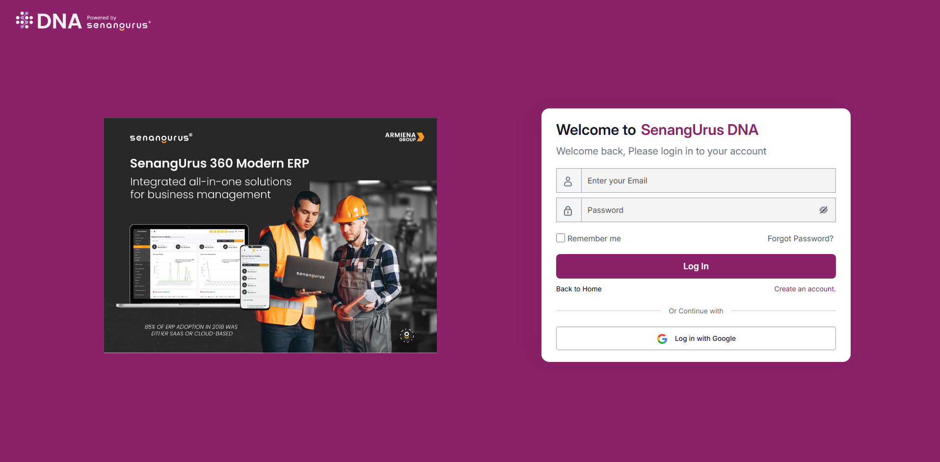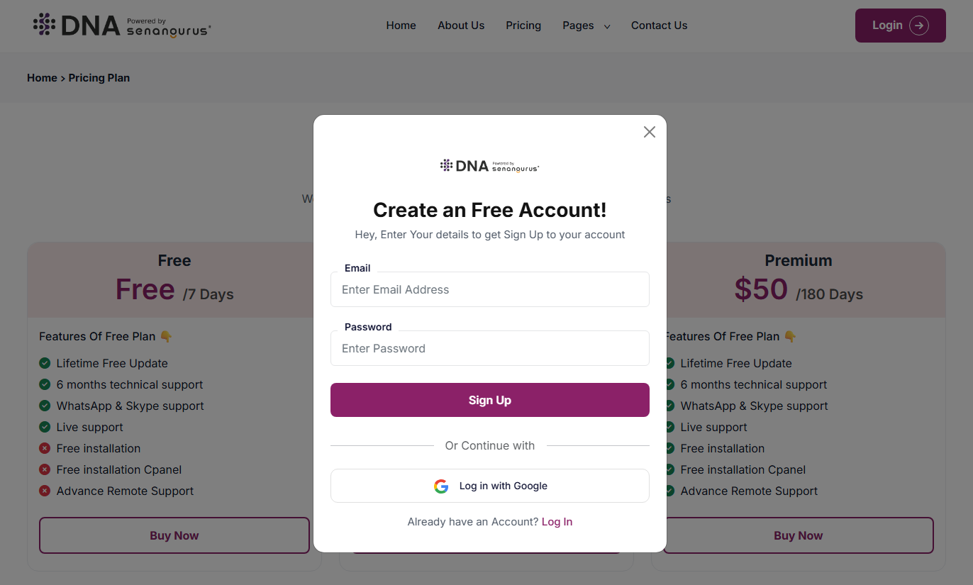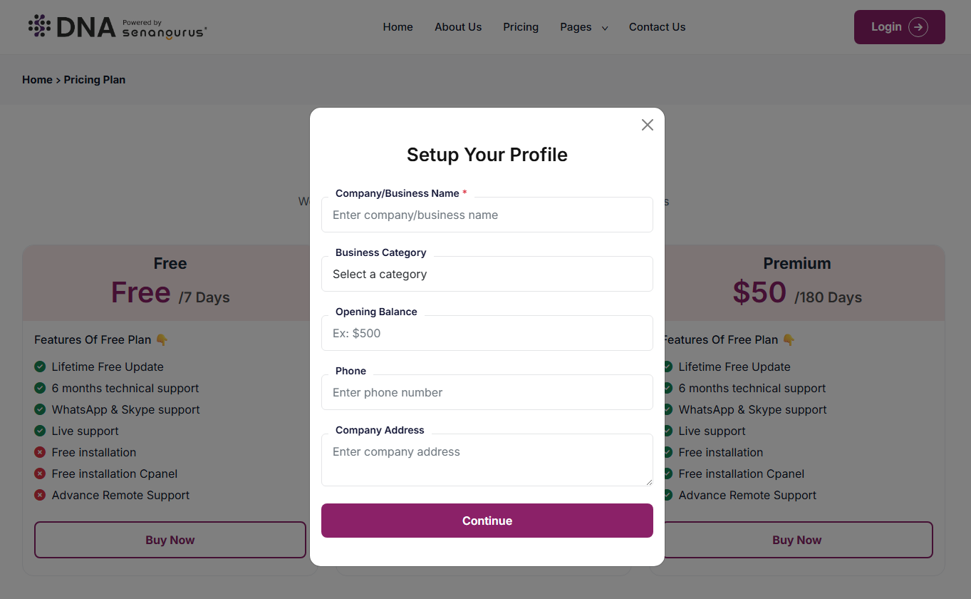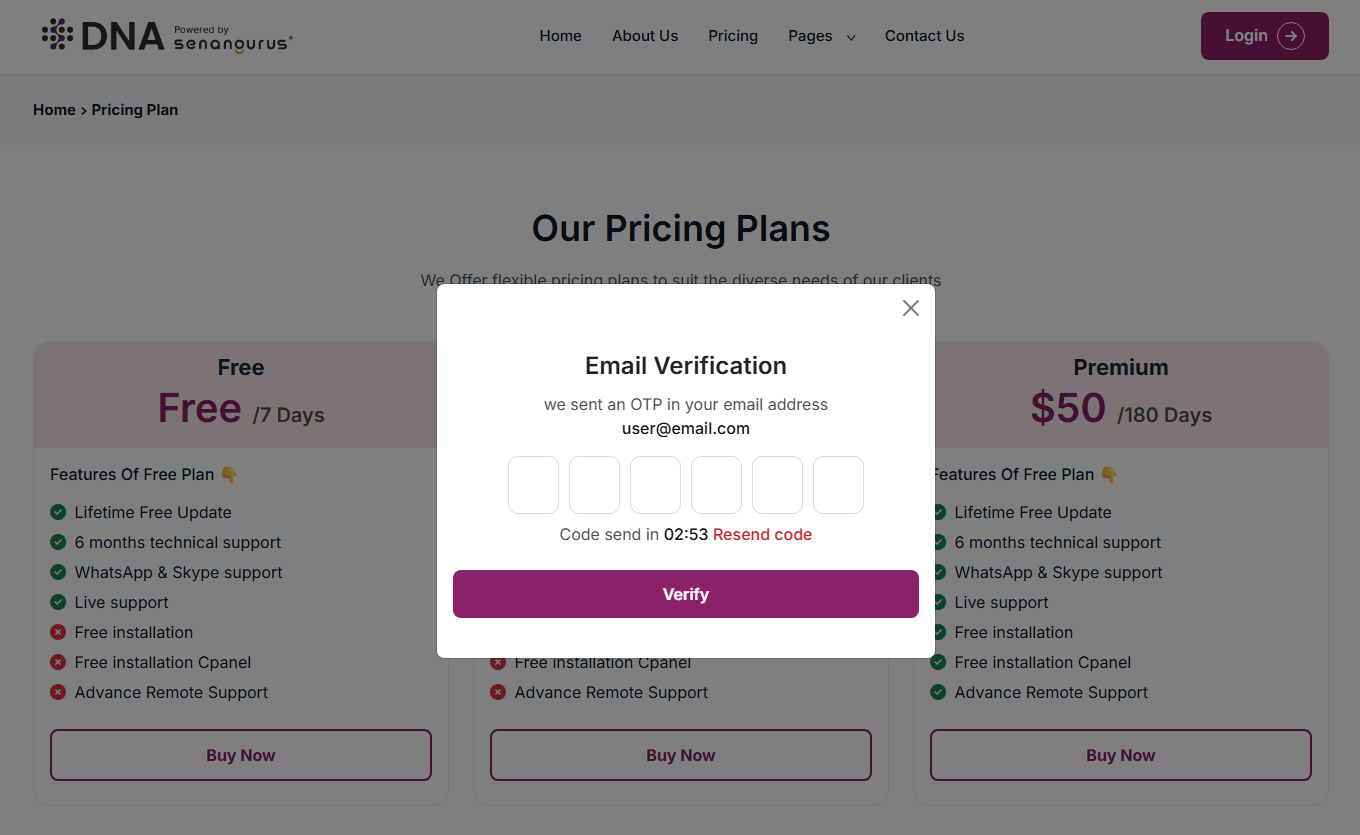 By clicking "Create an account", you will be redirected to the landing page plan section, where you can choose a subscription plan. SenangUrus DNA requires email verification, which a verification modal will appear where you must enter the code sent to your email. After verification, you will fill out the form, proceed to the payment gateway, and finally be redirected to your panel.