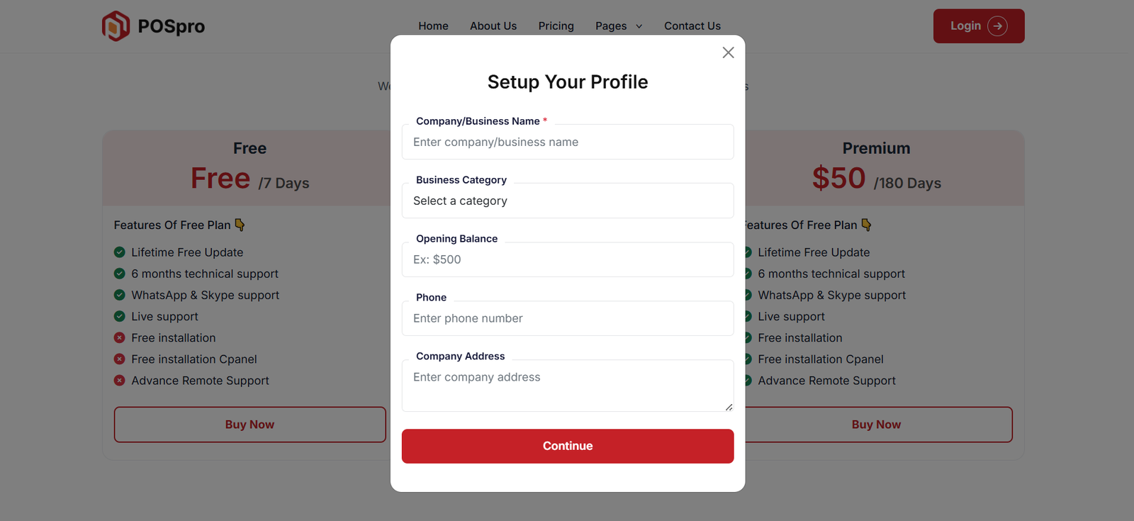 By clicking "Create an account", you will be redirected to the landing page plan section, where you can choose a subscription plan. If the admin allows login without email verification, a pop-up modal will appear where you need to enter your email and password. After that, another modal will appear to collect additional information. Once submitted, you will be redirected to the payment gateway. After completing the payment, you will be taken to your business panel.