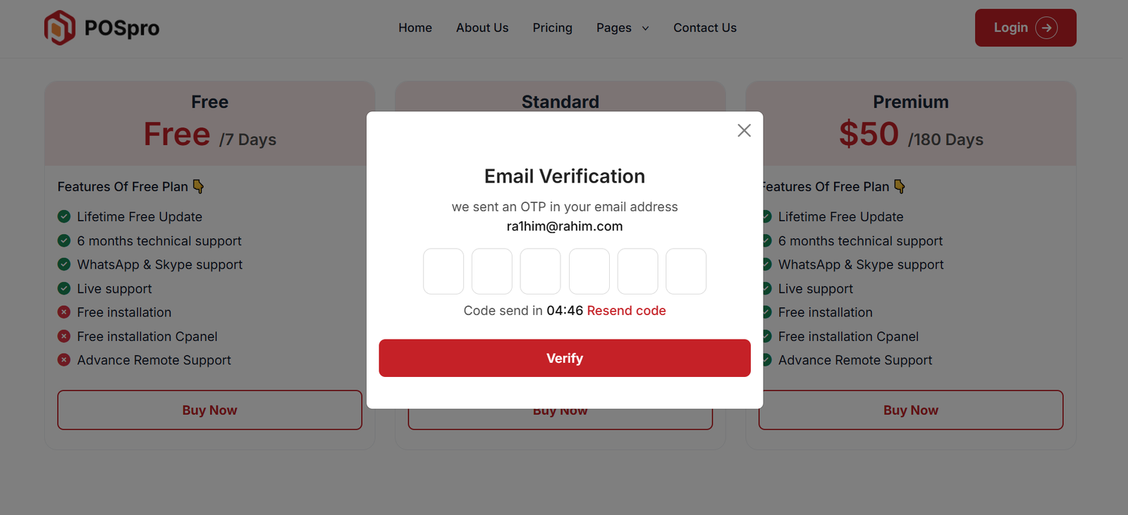 If the admin requires email verification, an extra step is needed. A verification modal will appear where you must enter the code sent to your email. After verification, you will fill out the form, proceed to the payment gateway, and finally be redirected to your panel.