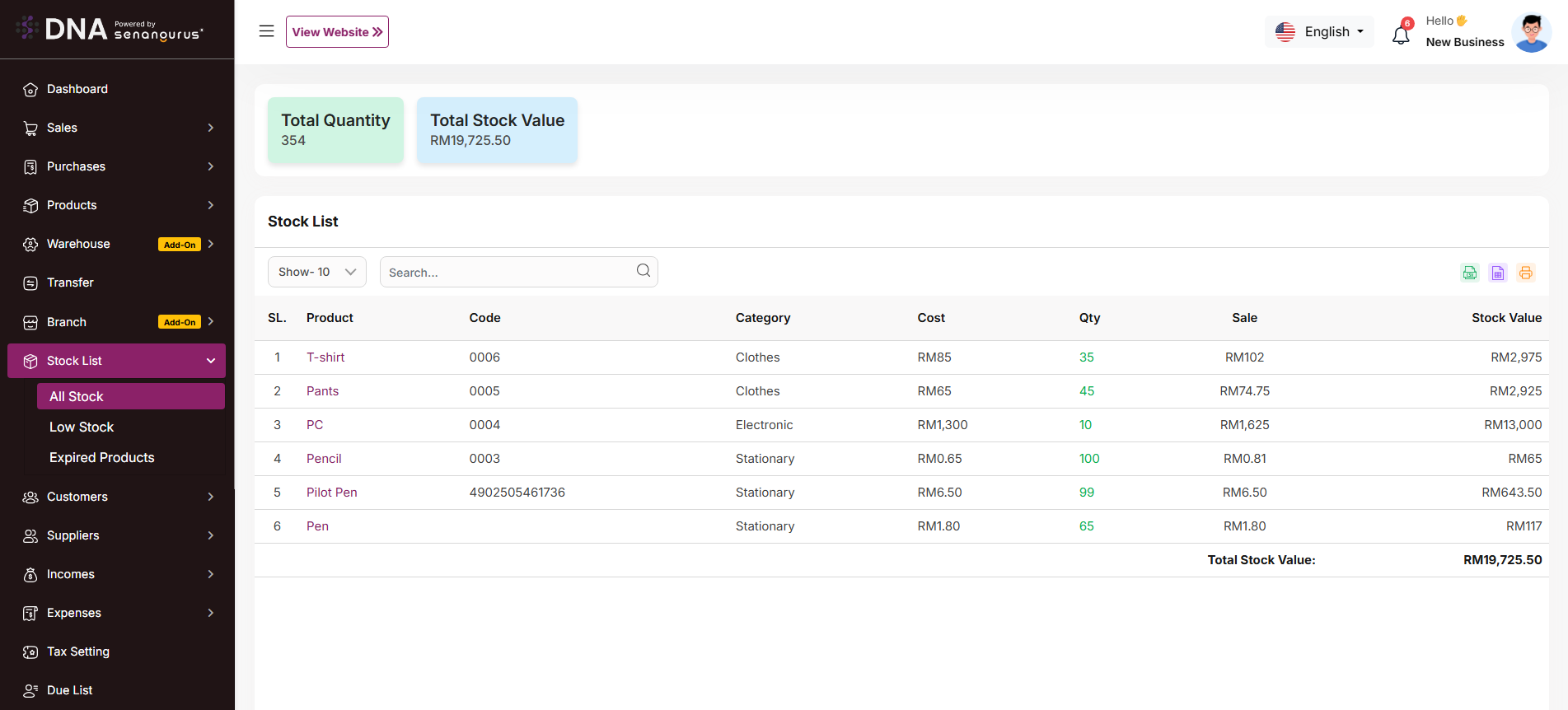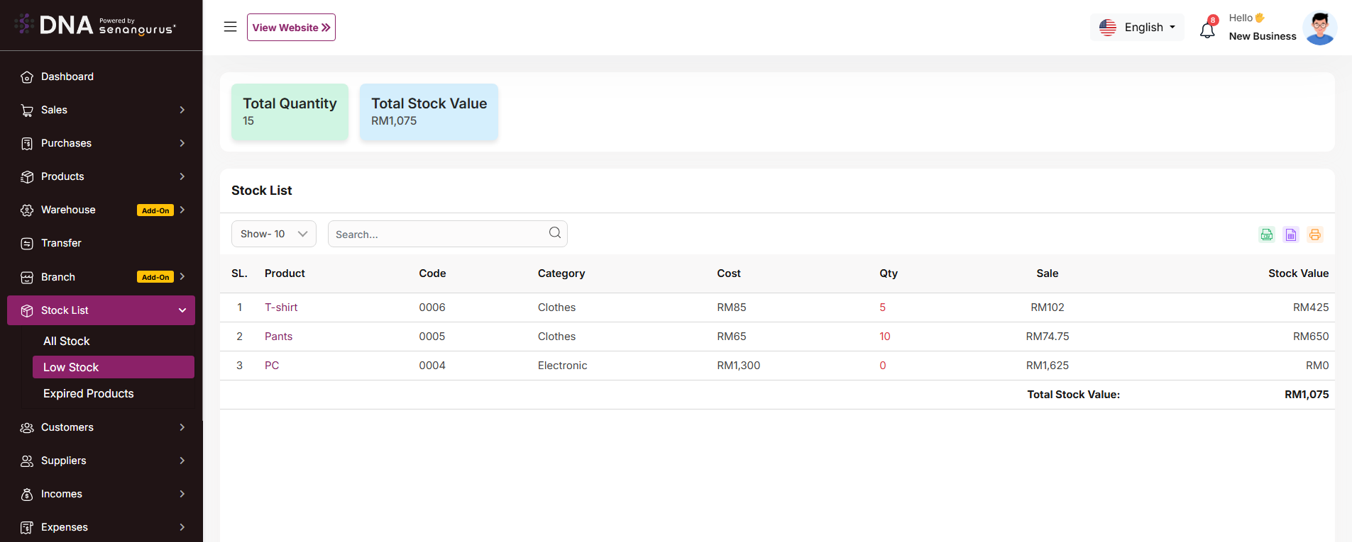 In this section, you can view the product list with available filtering options. The list can be exported as Excel or CSV, and there is also a print option. At the top, you can see the total quantity and stock value. You can also view low stock and expired products from the same dropdown, and their respective lists will be displayed.