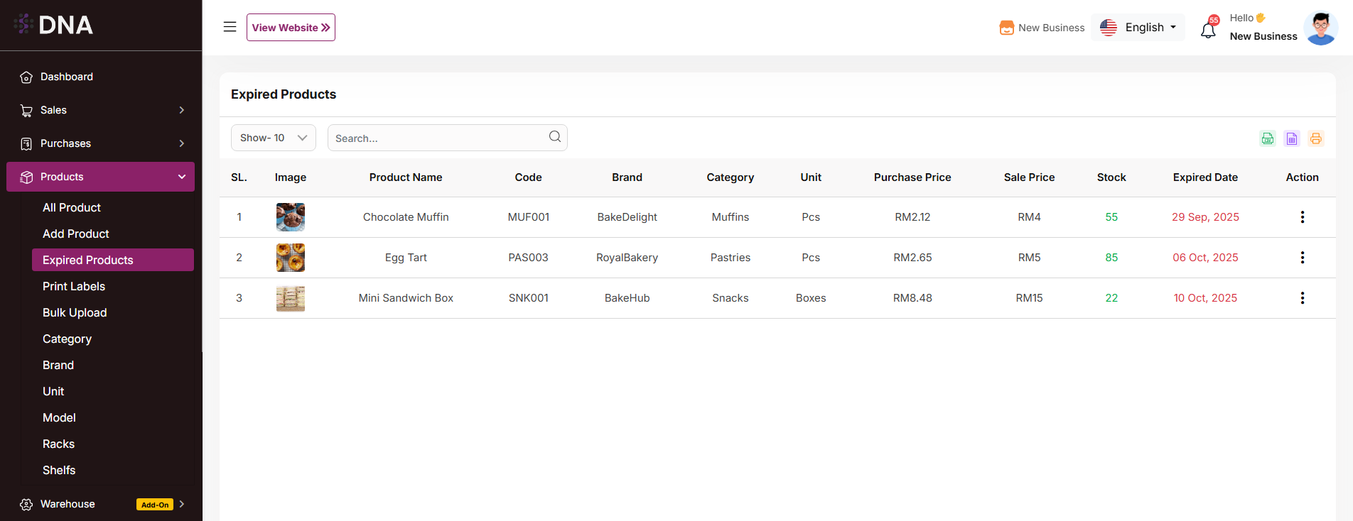 This section displays a list of expired products. You can use the available filtering options to refine the list. The data can be exported as Excel or CSV, and a print option is also available for convenience.