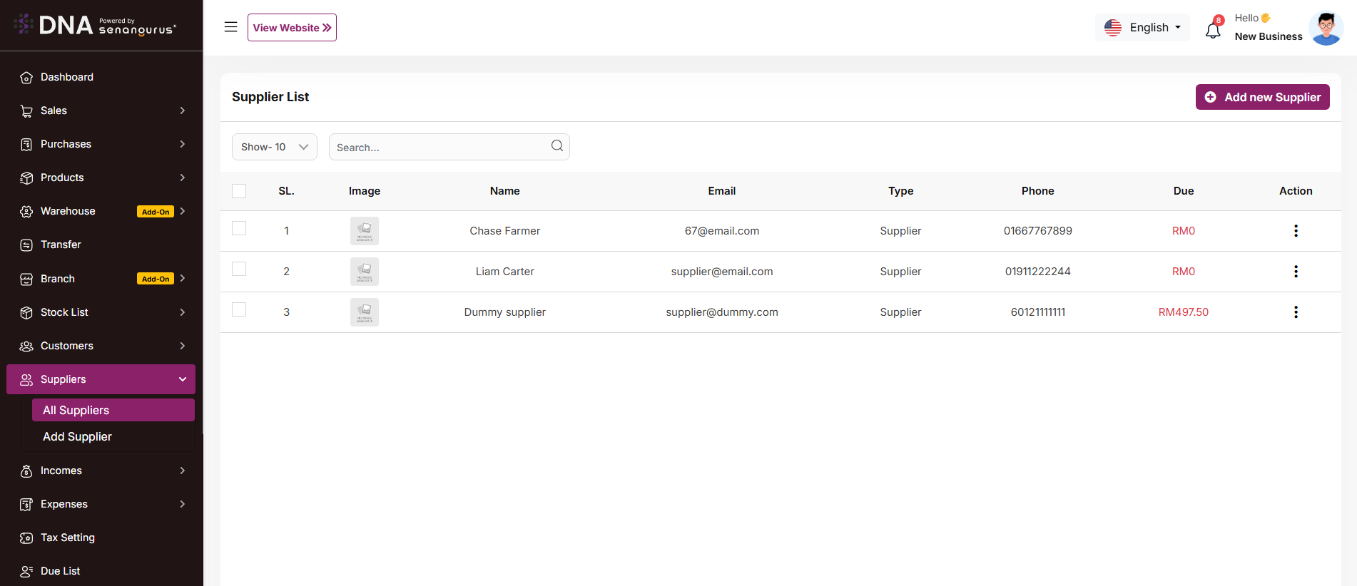 Here, you can view the Supplier list with a search filter. Additionally, you have the option to view, edit, delete, or use the multi-delete function.