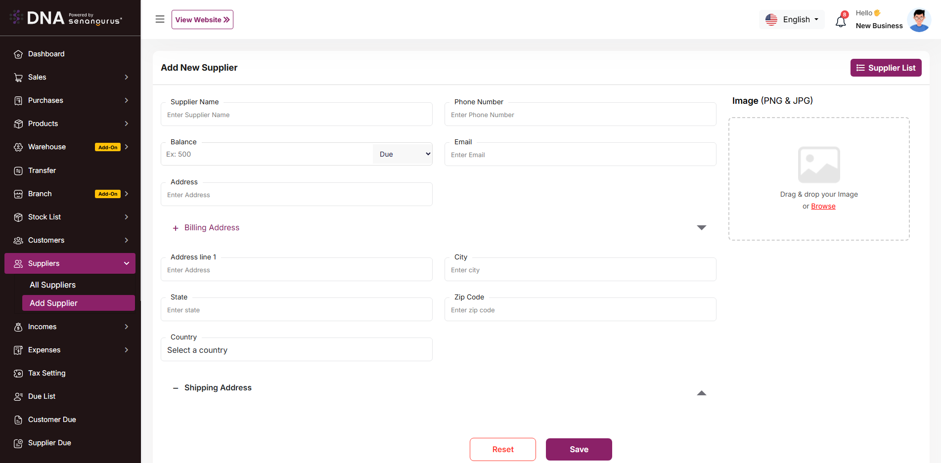 You can create a Supplier by filling out the required fields. Additionally, you can add an initial due amount to be stored.