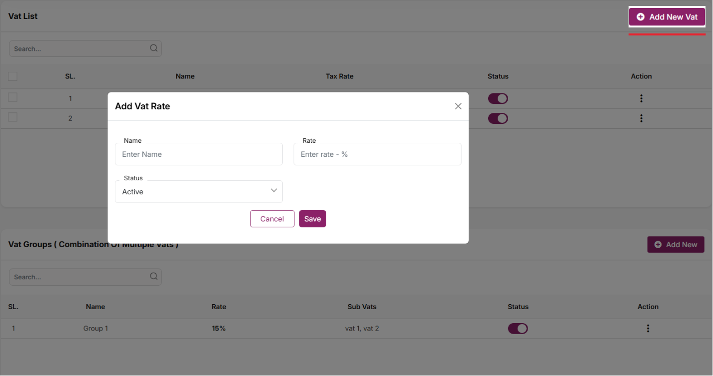 By clicking the Add New VAT button, a modal will appear. Fill in the required input fields and then click the Save button to add a new VAT entry.