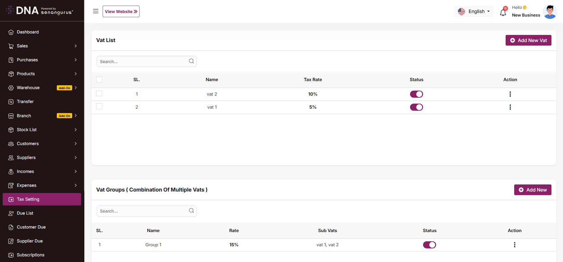 By clicking the Add New button, you will be redirected to the VAT Group creation page. Fill in the required input fields and then click the Save button to add a new VAT group.