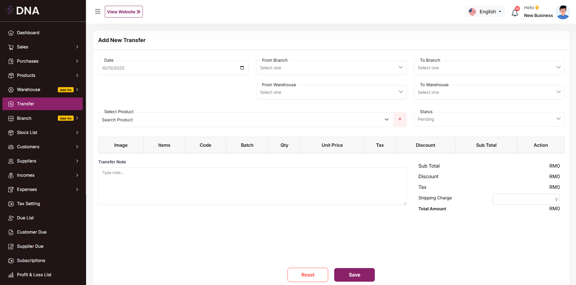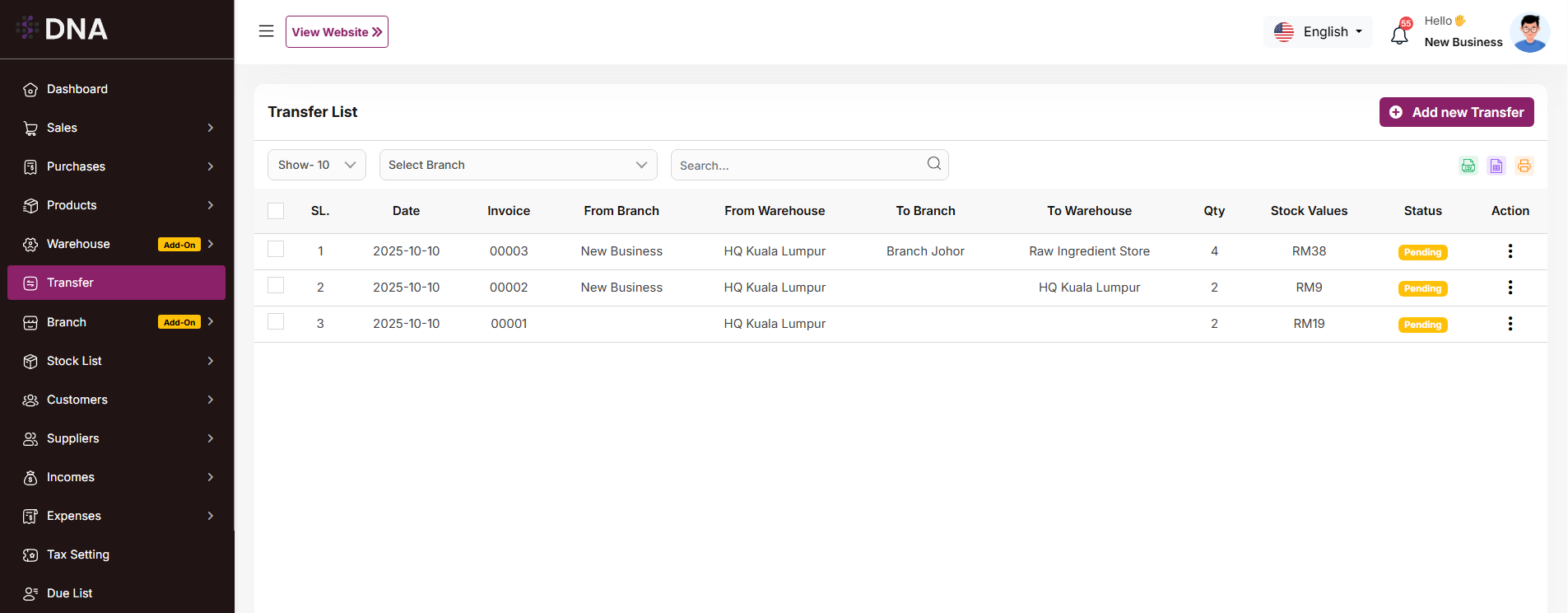 * You can transfer products from one branch to another branch.