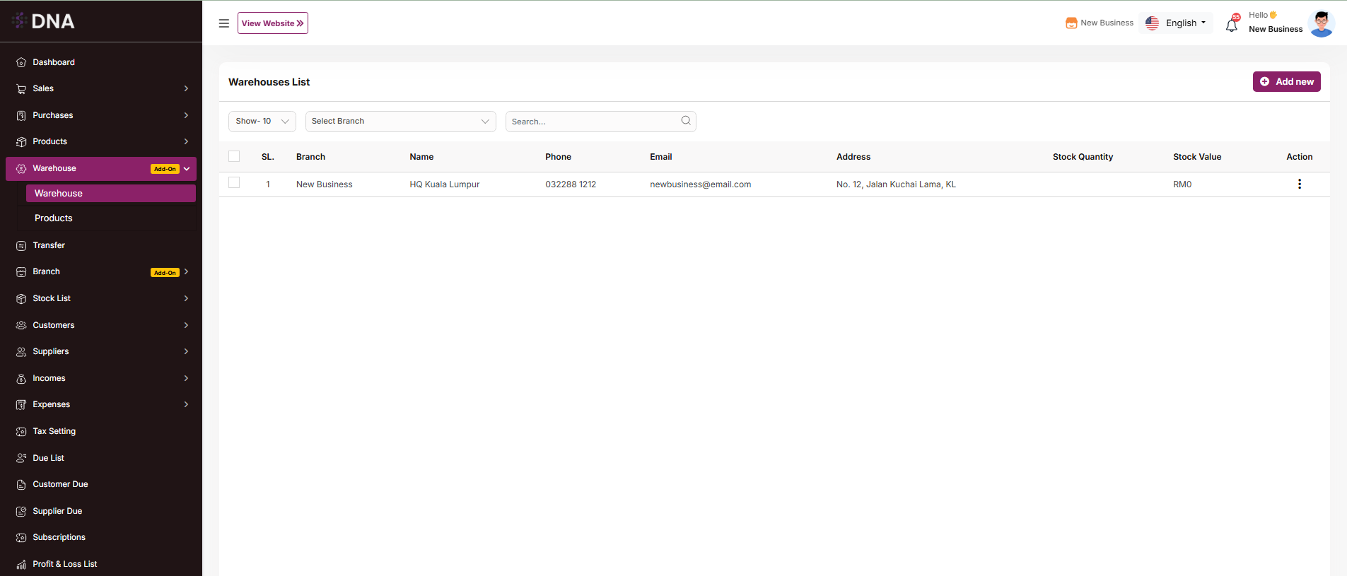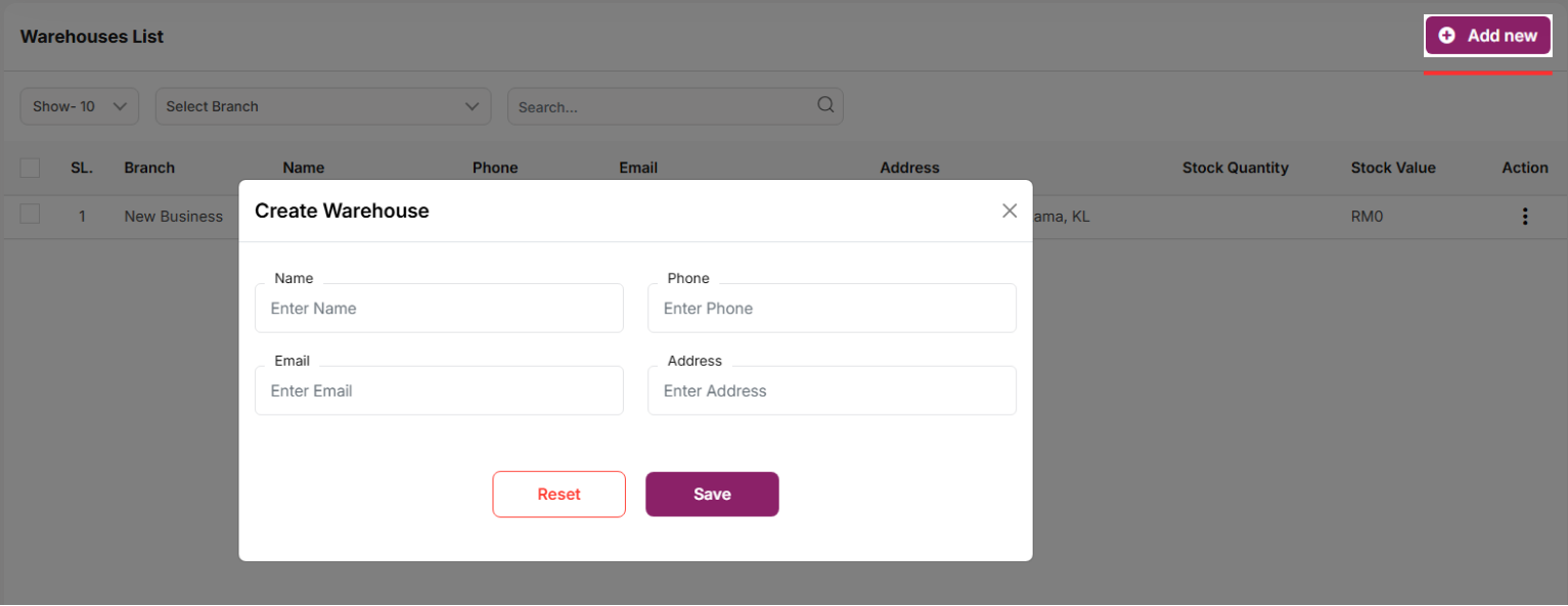 Use the search bar to find a specific warehouse by name, phone, email, or address. Per-page filtering is also available. Click the "Add New" button to open a modal where you can enter the required information to create a new warehouse. All mandatory fields must be completed. Click the three dots under the "Action" column to edit, delete, or view details of a warehouse.